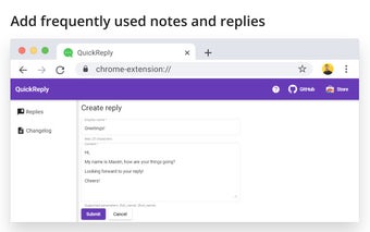 总之,QuickReply是一个方便的Chrome插件,可以简化您的复制/粘贴体验,帮助您保持笔记的组织,并实现快速消息个性化。凭借其用户友好的界面和节省时间的功能,QuickReply是任何希望简化工作流程并提高生产力的人必备的工具。
